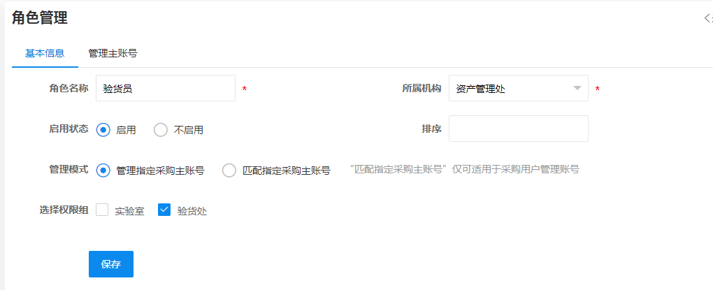 此处仍以验货员为例,角色名称写验货员或验货处,选择验货人员所在部门或机构,管理模式选择为指定采购账号。