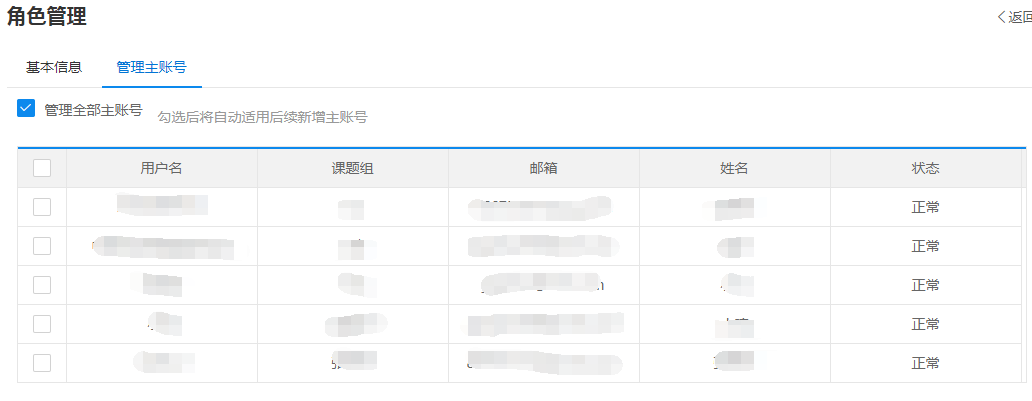 填写完后点击“管理主账号”来为该角色设置可见的课题组,勾选上方管理全部课题组即可看见现有课题组的发货单,后期添加的课题组会自动添加进来。无需再次操作