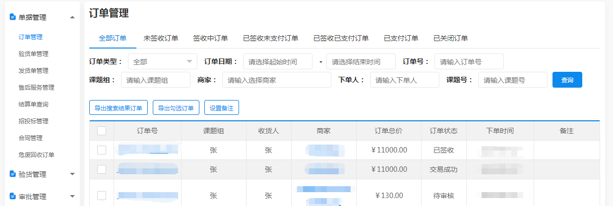 点击“单据管理”-“订单管理”来查询账户权限范围内所有订单。