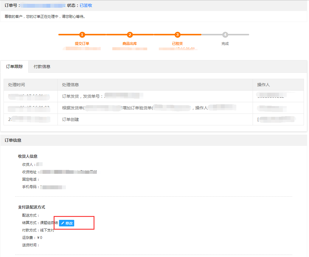 点击订单号查看订单详情,未开始结算的订单可以在此修改结算方式。(修改结算方式近针对单独一笔订单修改,不会对院所设置进行改动)