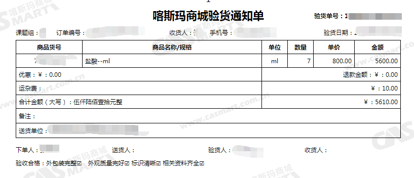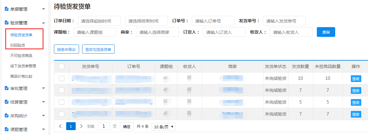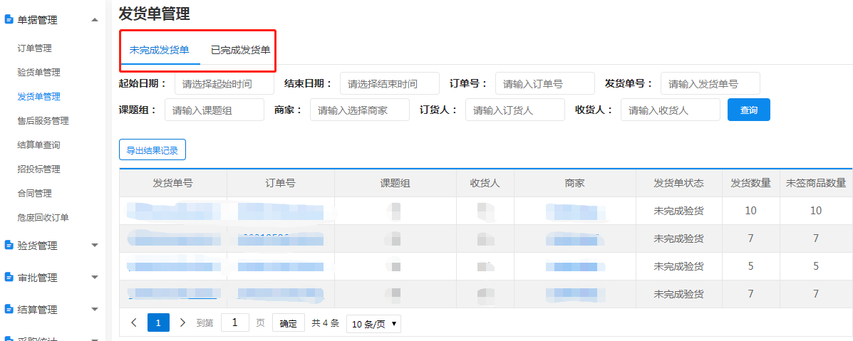 在“单据管理”-“发货单管理”中查看账号权限范围内的发货单,可根据是否完成验货、时间、课题组发货单号等进行筛选。