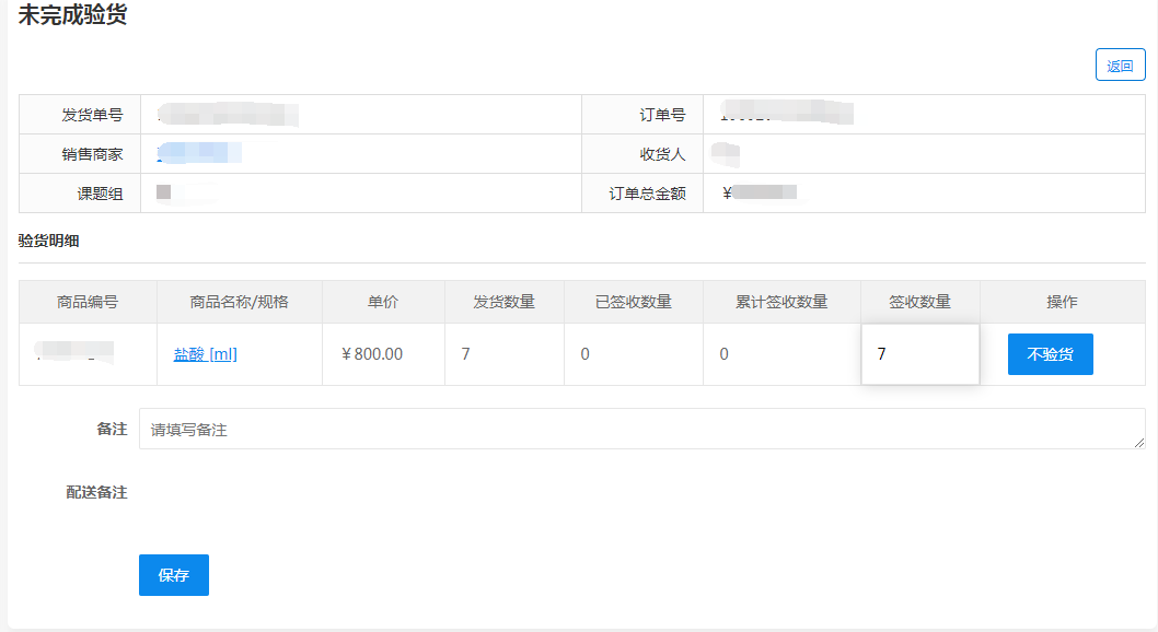 点击右侧签收按钮进行验货签收。当商家的分批发货时,需要在“签收数量”中修改实际签收数量并保存,待商家二次发货之后在同一发货单内二次签收,系统会在每次签收后生成一次验货单。验货成功后验货员需要按照院所要求打印验货单。