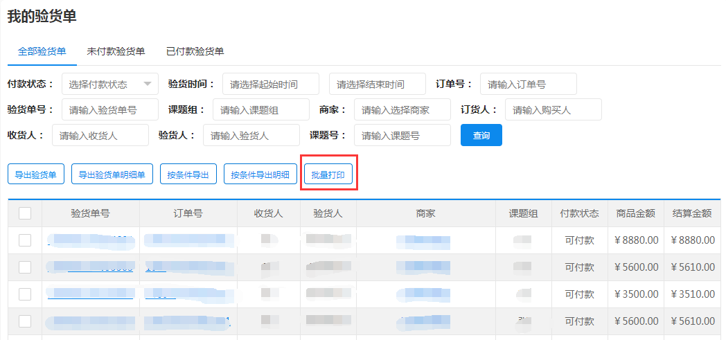 或者在多张发货单全部签收后,在“单据管理”-“验货单管理”中勾选相应单据后点击“批量打印”。