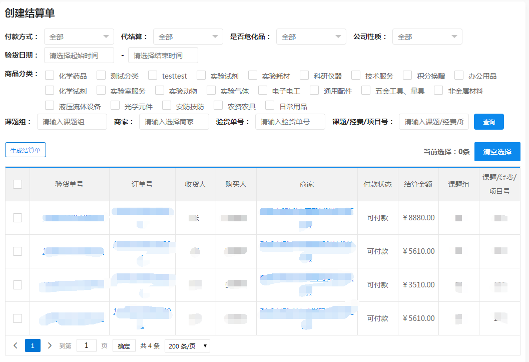 当院所进入结算周期后,需要财务人员在“结算管理”-“创建结算单”中针对所有验货单来生成结算单。财务可根据商品分类分开处理或者勾选全部验货单进行结算。