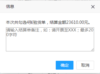 点击“生成结算单”后,系统会提示本次结算的验货单数量以及总金额,同时需要财务填写备注,将开票要求以及截止时间填写在备注信息内,以便商家按时按规定处理。