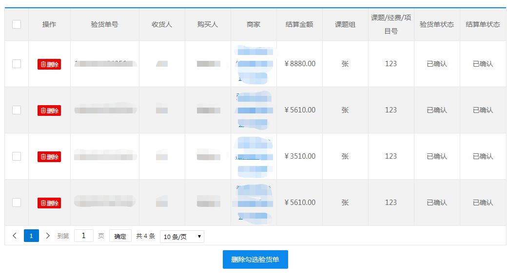 结算单生成后需要现在“待确认结算单”中进行二次核对,无误后确认结算单并等待商家邮寄发票。若此时发现有验货单需要延迟结算,可在结算单详情内最下方的验货单列表中勾选相应的验货单并删除,该验货单会在下次发起结算时再结算。