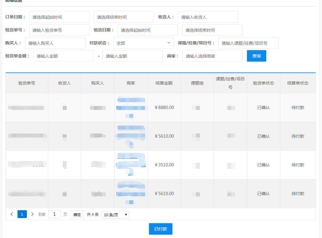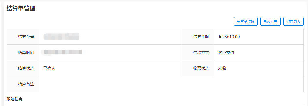 待发票收集完成后,在“已确认结算单中”点击“已收发票”来确认。同时点击“结算报账”使结算带进入结算状态并开始给商家汇款。汇款完成后在“待付款结算单”内点开结算单详情,在页面最下方点击已付款。结算流程结束。