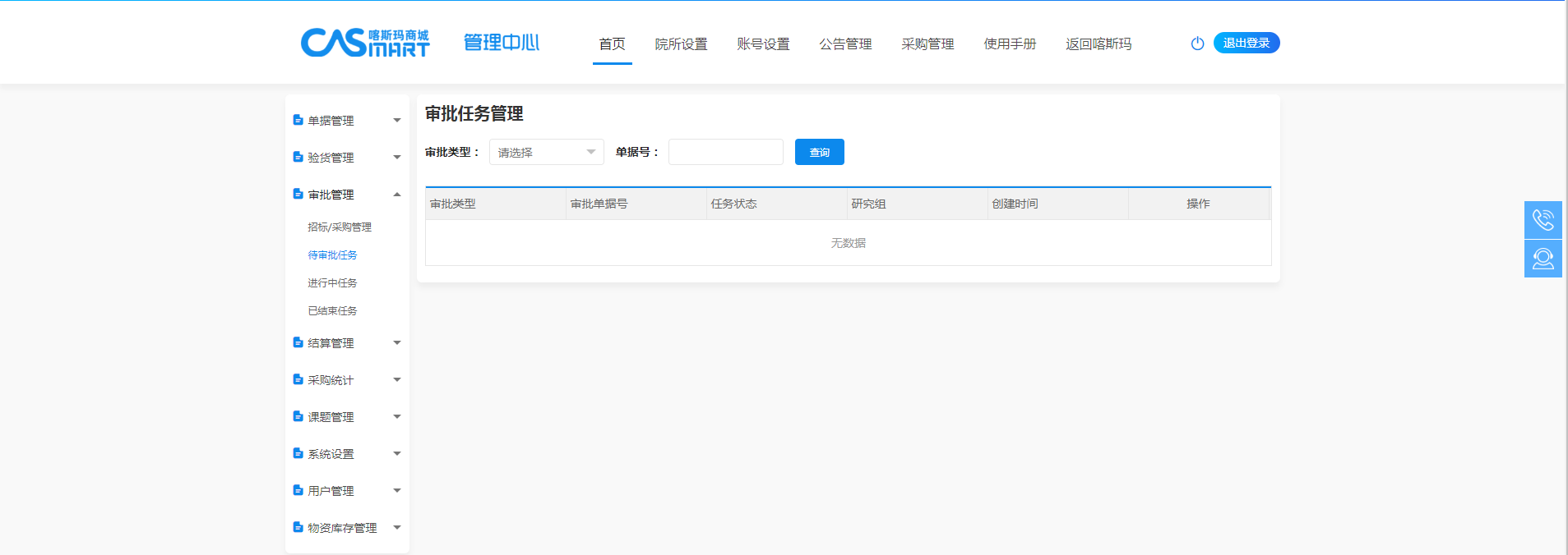 点击待审批任务,展示院所内所有待审批任务,并可执行搜索与查看功能。