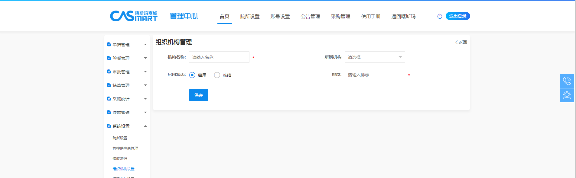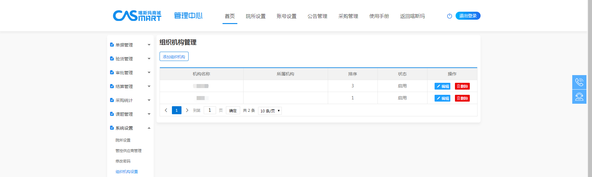 点击组织机构设置,进入组织机构设置界面,展示院所内组织机构信息,可进行创建、修改、删除操作。