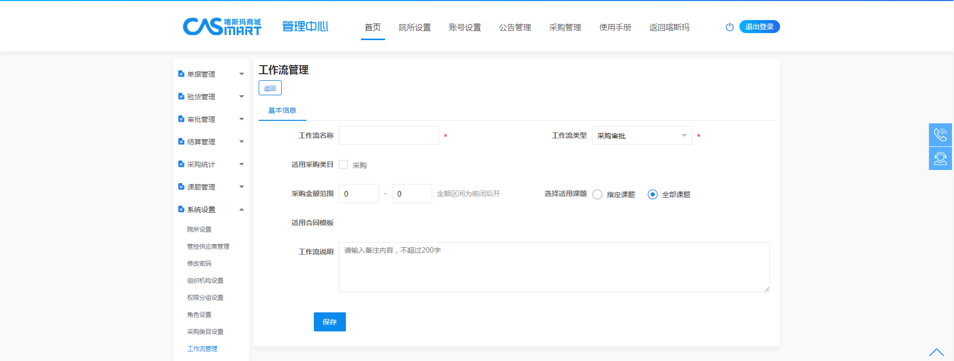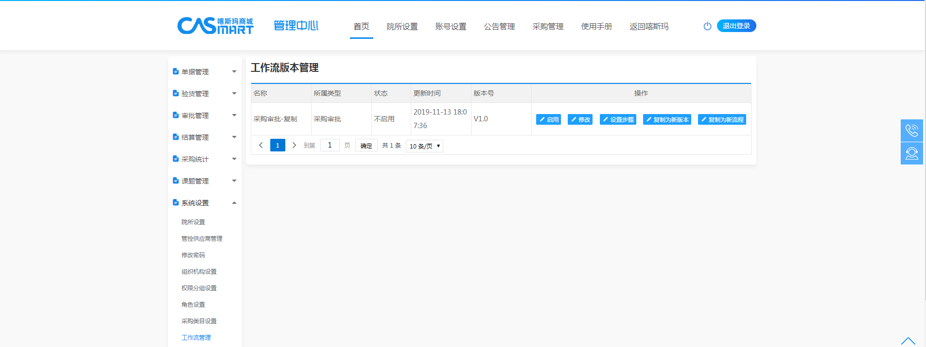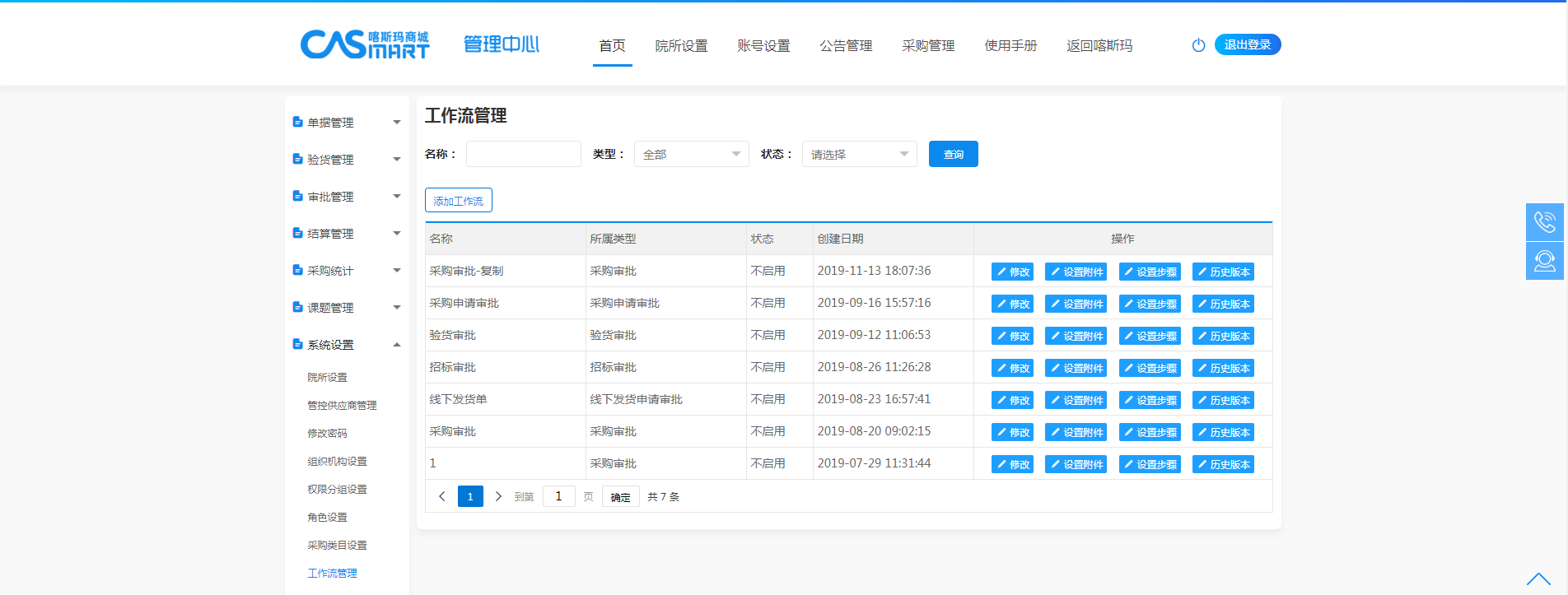点击工作流管理,进入工作流管理界面,展示院所所有审批流,可进行搜索、创建、修改操作。