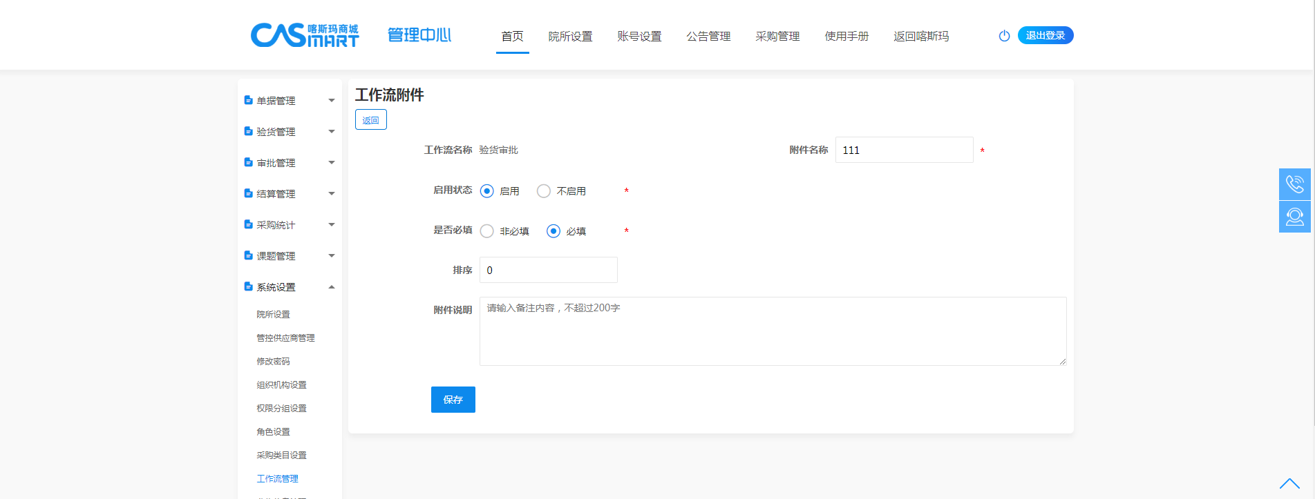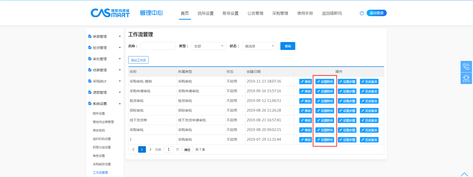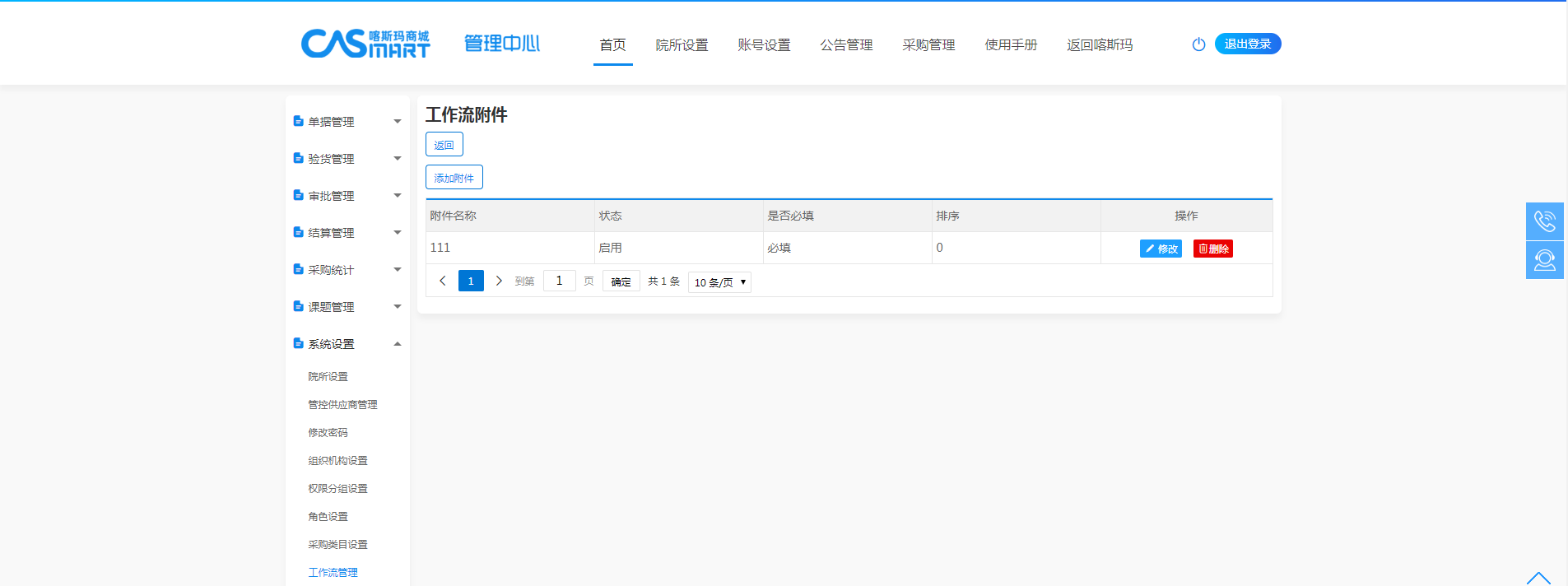 通过设置附件可进行工作流附件的创建、修改、删除操作。