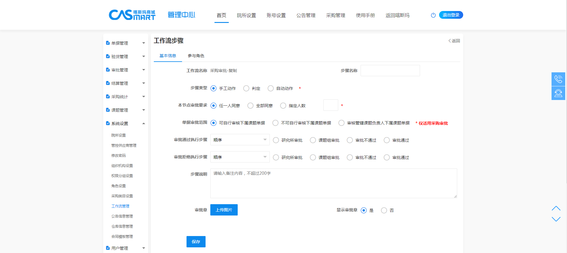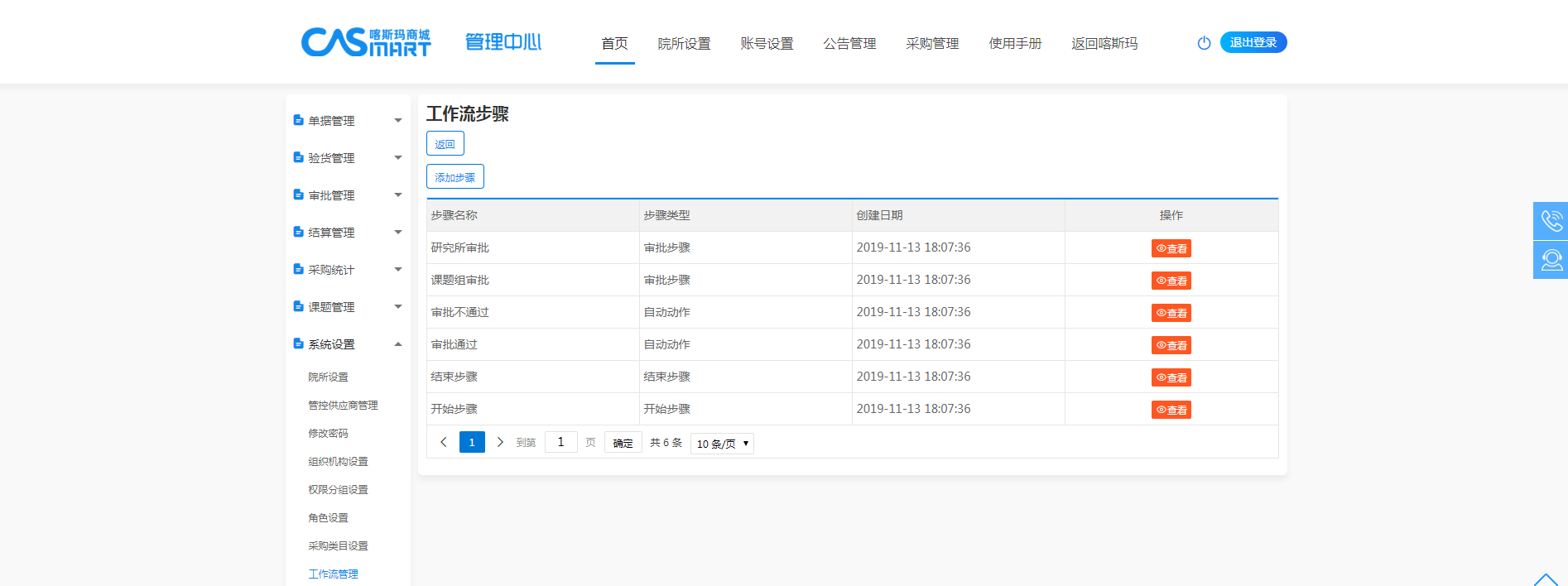 通过设置步骤,可对工作流的步骤进行创建、修改、查看、删除操作。
