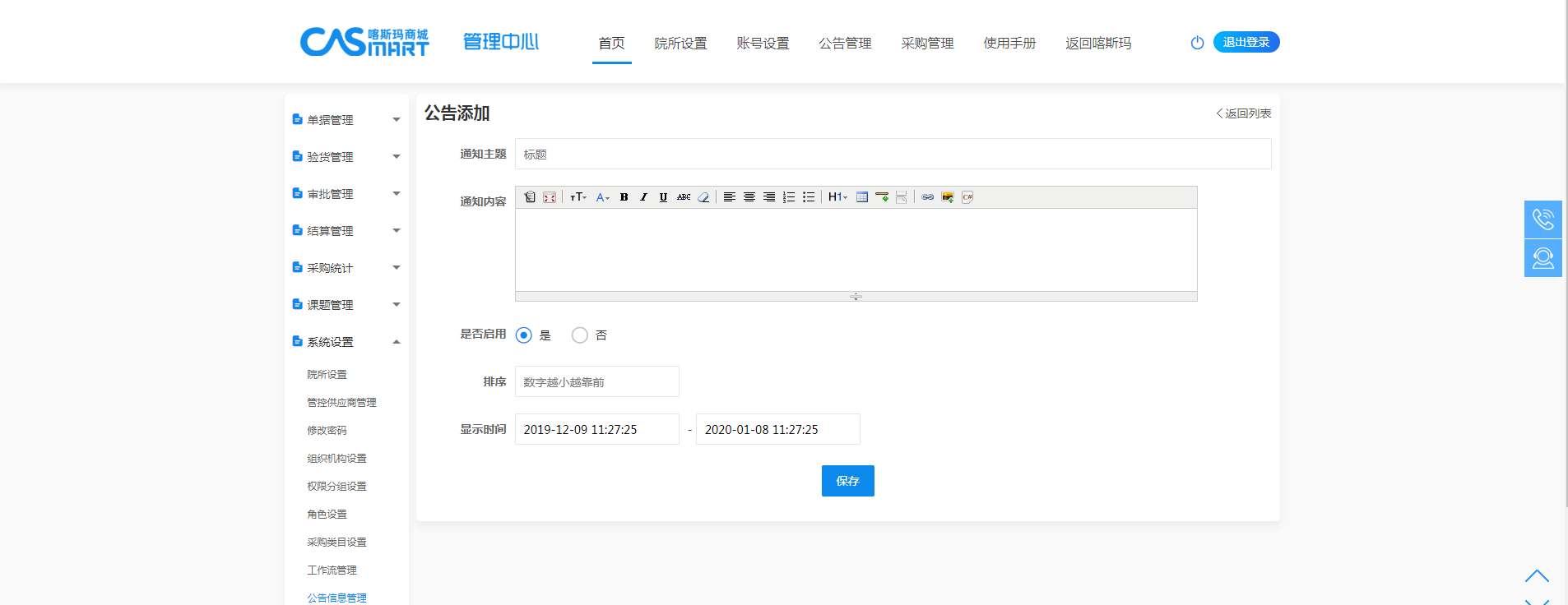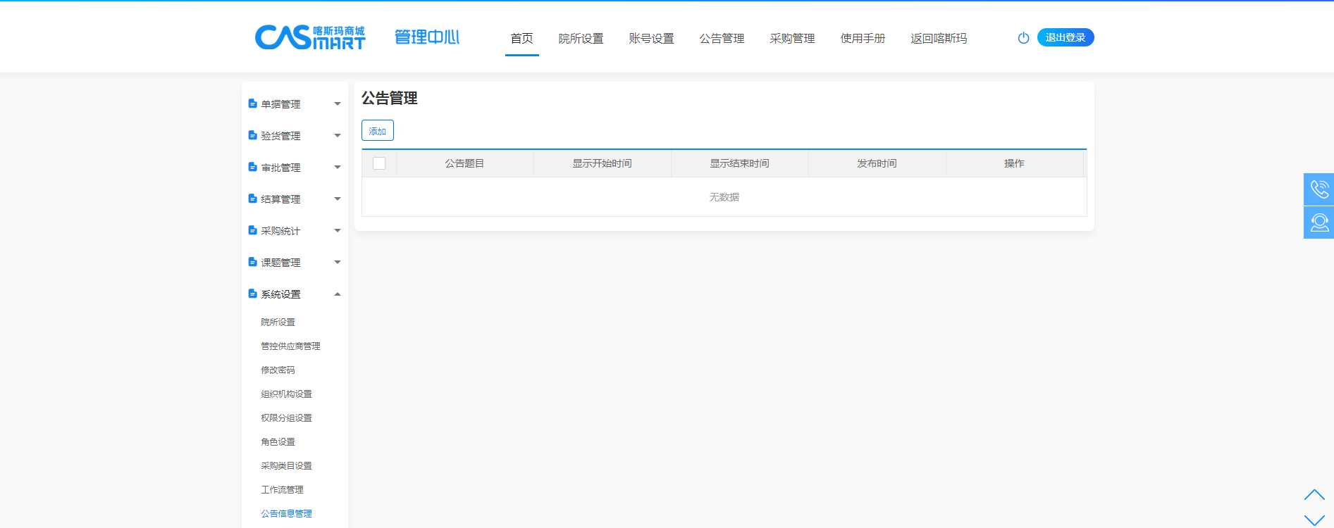 点击公告信息管理,进入公告信息管理界面,展示院所所有公告信息,并对公告信息进行创建、修改、删除操作。