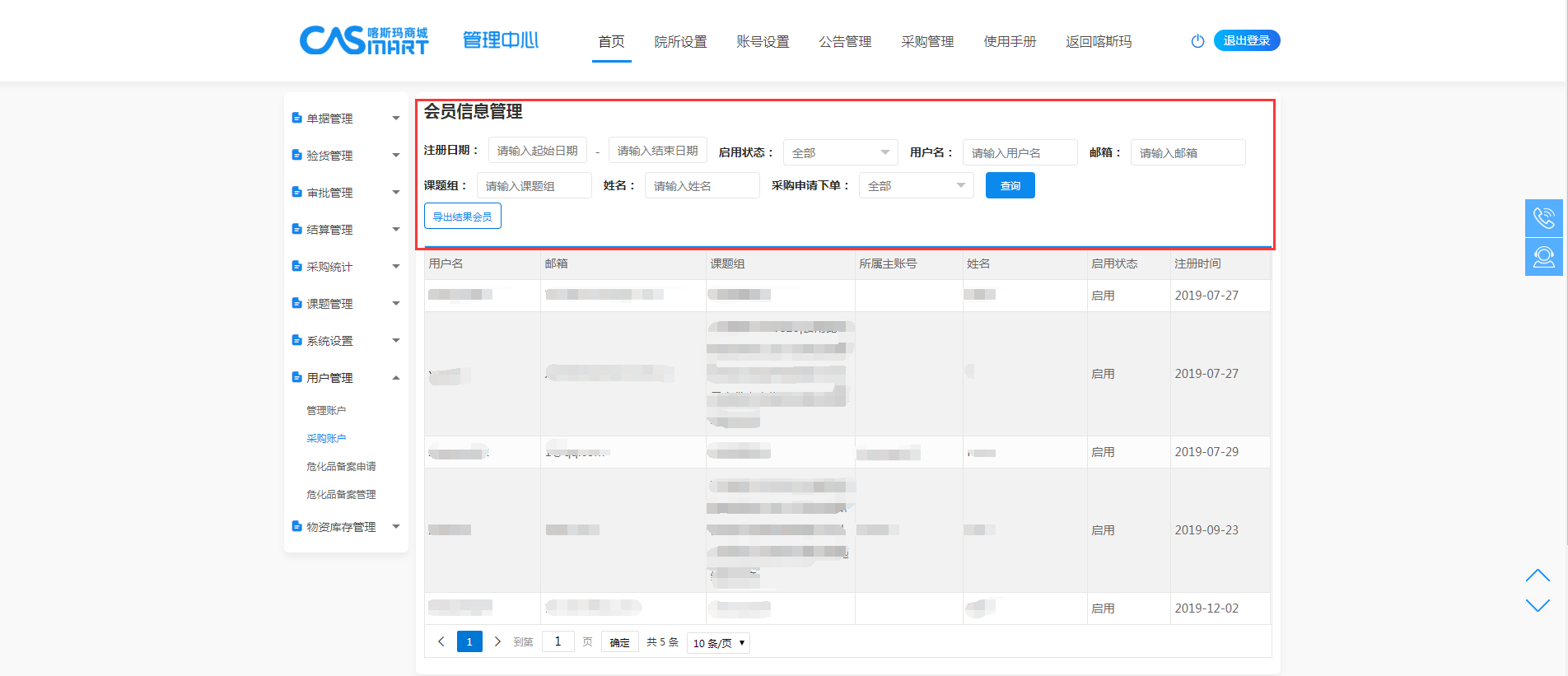点击采购账户,进入采购账户界面,展示院所内全部采购账户,可进行搜索与与导出操作。