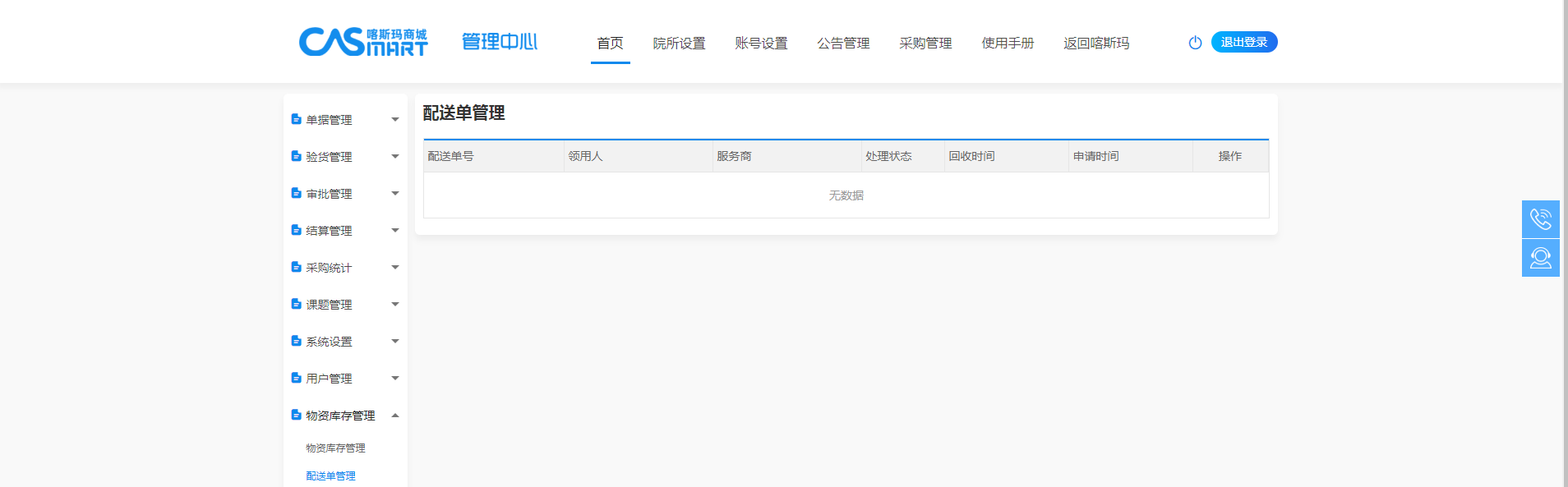 点击配送单管理,进入配送单管理界面,展示院所全部配送单,通过查看显示详情。