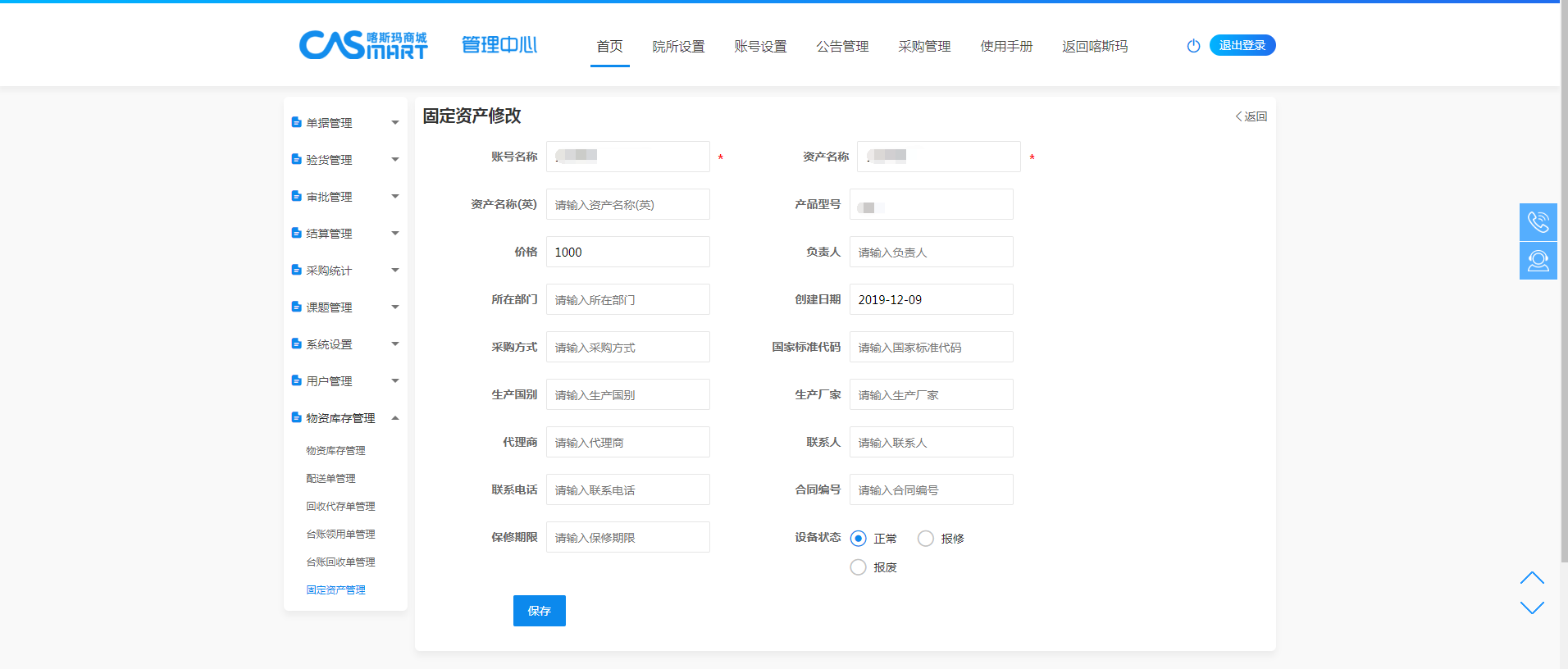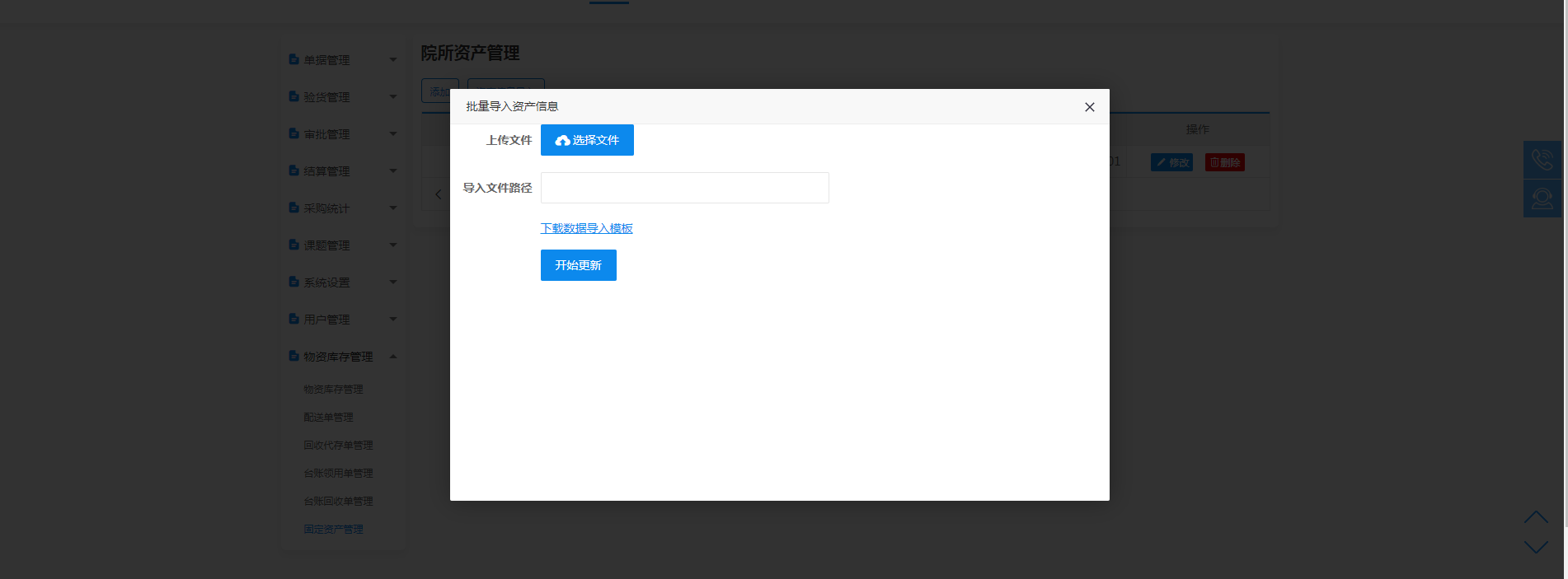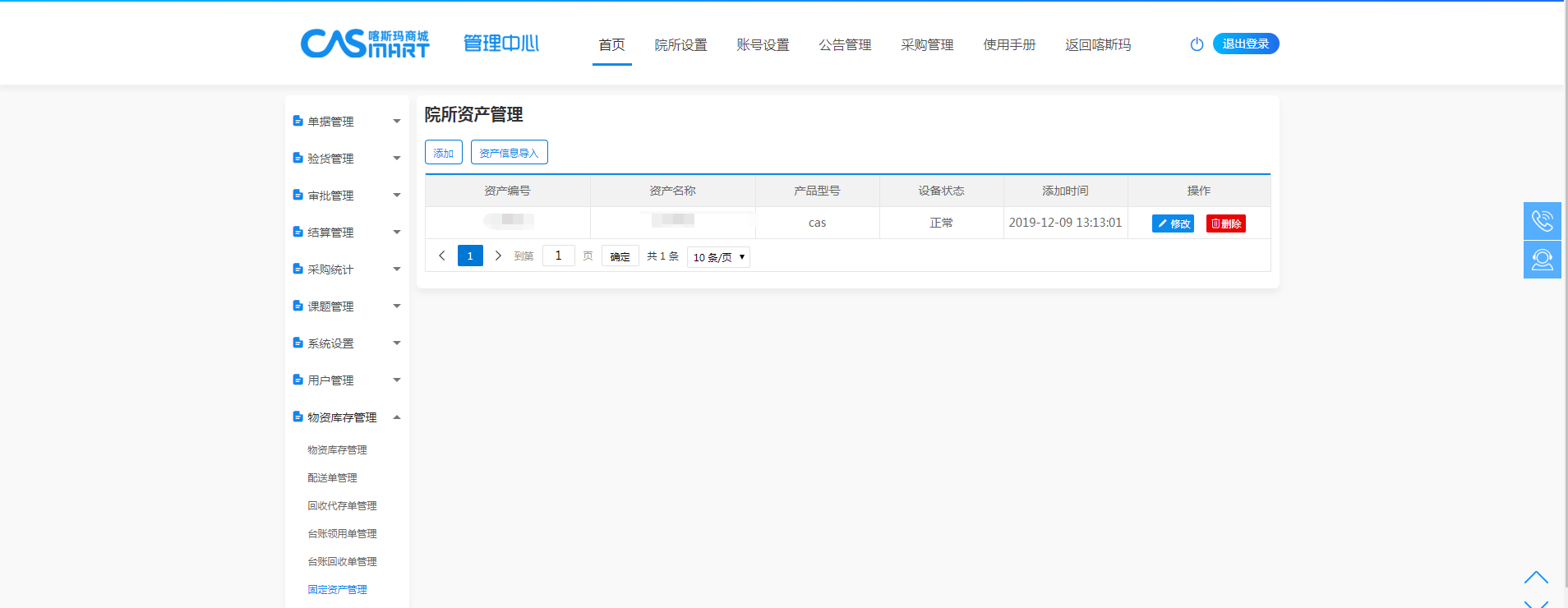 点击固定资产管理,进入固定资产管理界面,展示所有固定资产数据,可进行添加、修改、删除、批量导入操作。