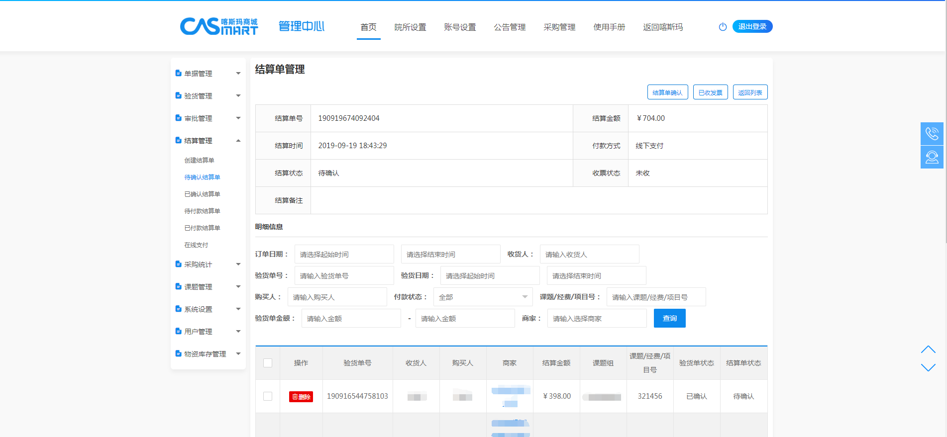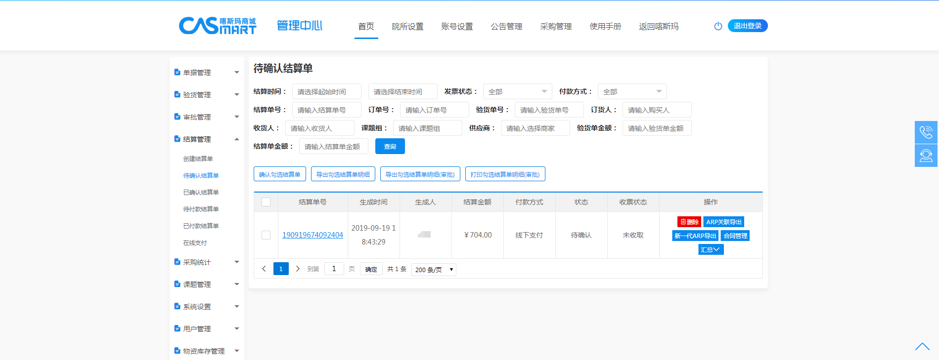 点击待确认结算单,进入待确认结算单界面,展示所有待确认结算单,并提供搜索、导出、批量确认、删除操作。
