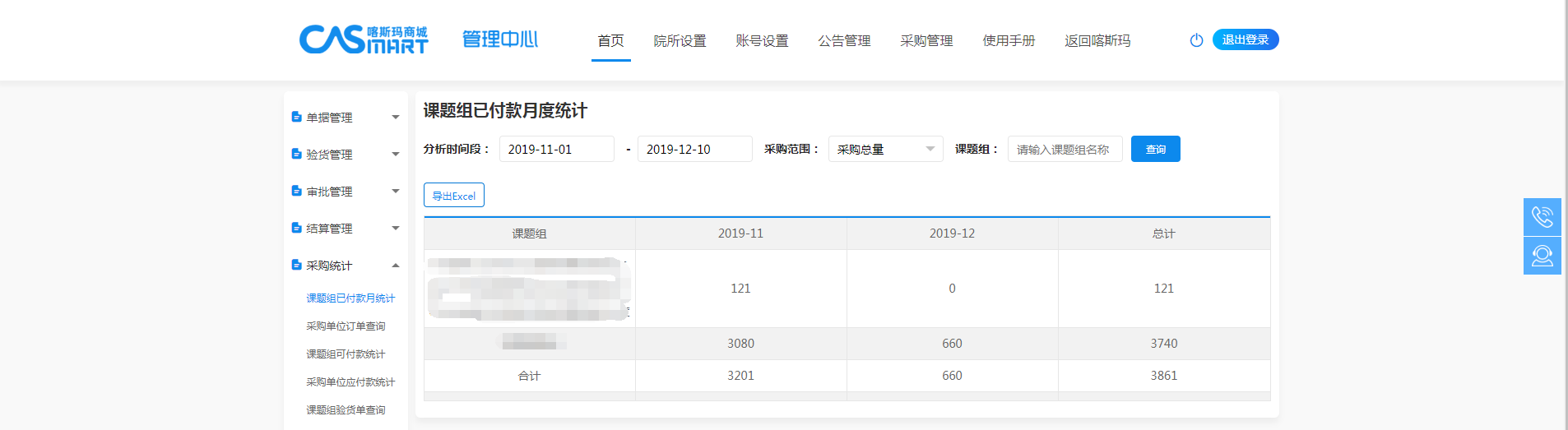 点击课题组已付款月统计,进入课题组已付款月统计界面,展示相应的统计数据。