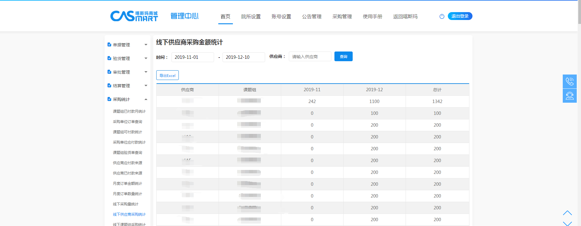 点击线下供应商采购统计,进入线下供应商采购统计界面,展示统计数据并可执行搜索与导出功能。