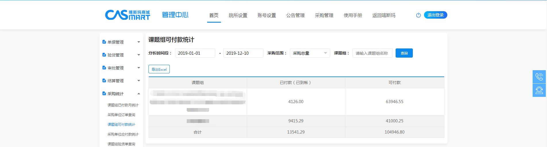 点击课题组可付款统计,进入课题组可付款统计界面,提供统计功能并可进行搜索与导出。