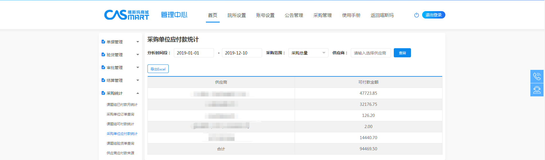 点击采购单位应付款统计,进入采购单位应付款统计,提供统计、搜索、导出功能。