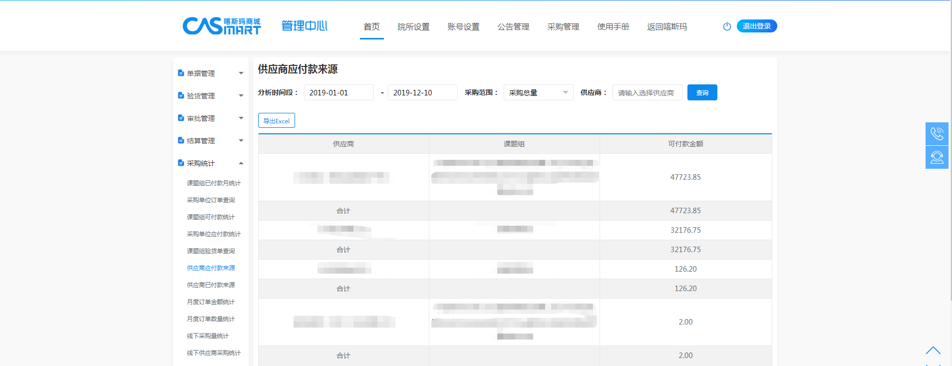 点击供应商应付款来源,进入供应商应付款来源界面,提供数据统计可进行搜索与导出功能。