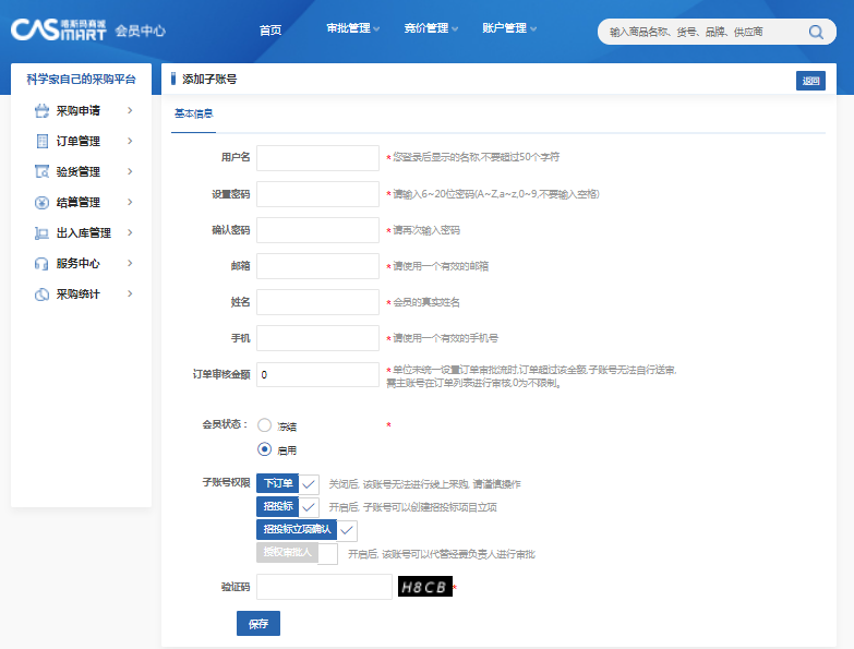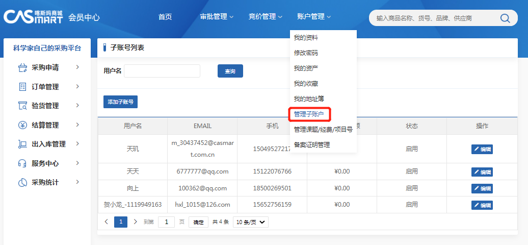如果您的账号为院所下发的课题组主账号,则您可以为您的组员设置子账号,方便采购。点击“账户管理”-“管理子账户”进入管理页面新增或修改子账户。