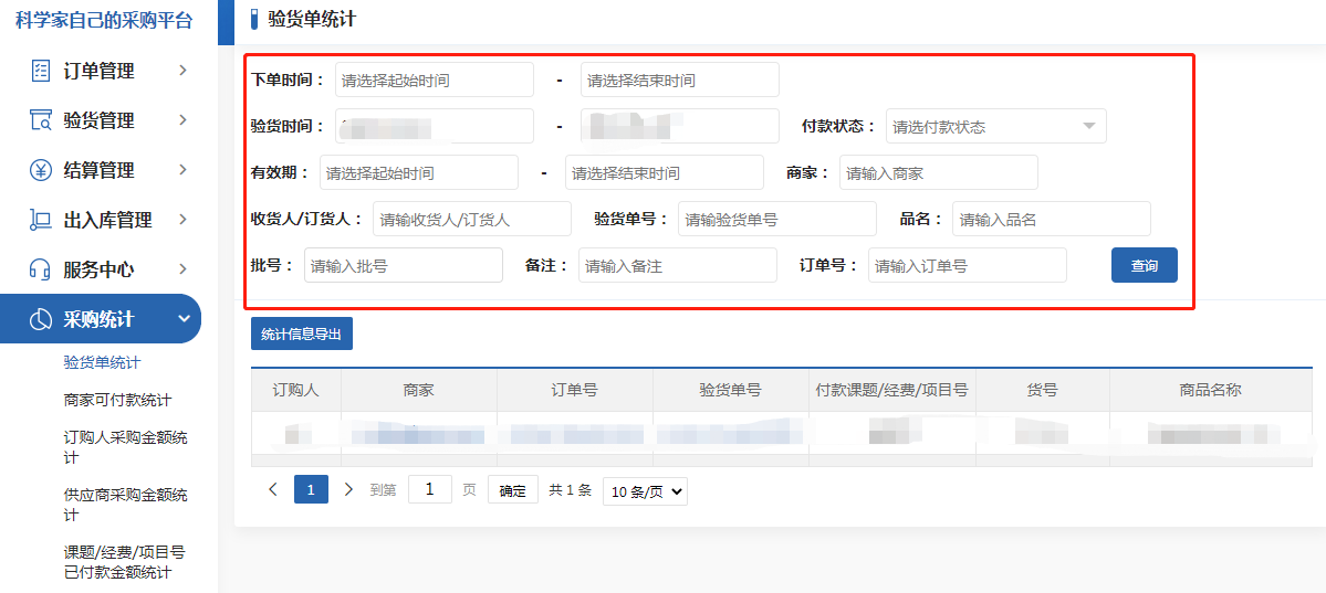 点击验货单统计,进入验货单统计界面,展示会员所有验货单信息并提供搜索与导出功能。