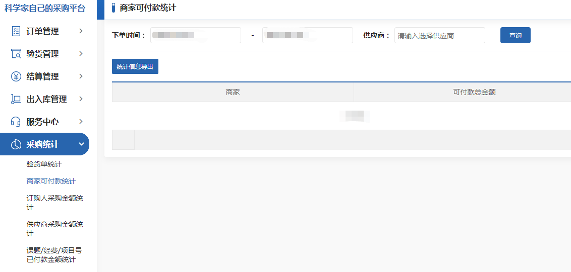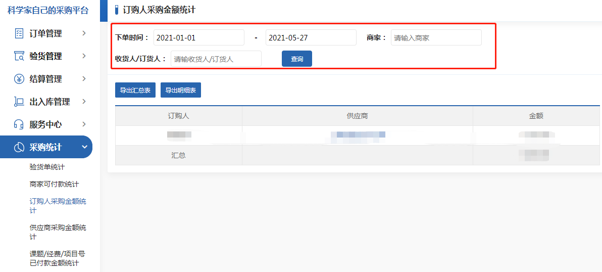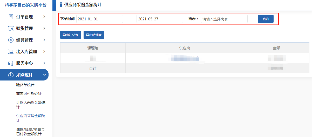 点击供应商采购金额统计,进入供应商采购金额统计界面,显示每个供应商的购买金额,并可进行搜索与导出。