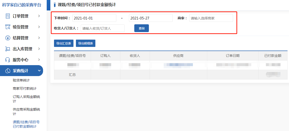 点击课题/经费/项目号付款金额统计,进入课题/经费/项目号付款金额统计界面,展示课题的每次交易,并提供搜索与导出功能。