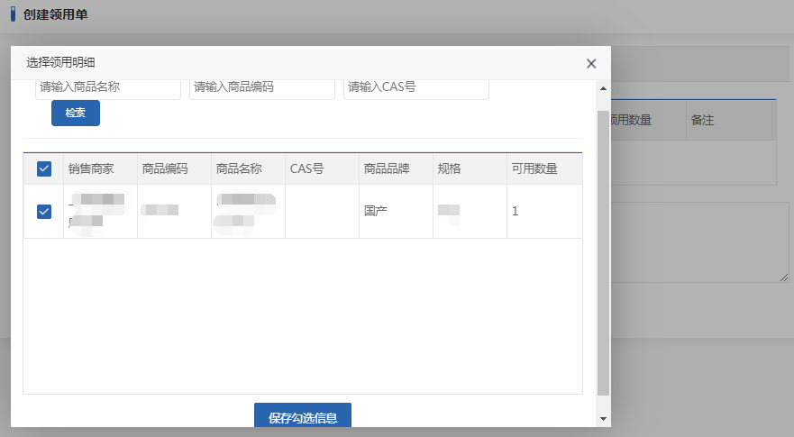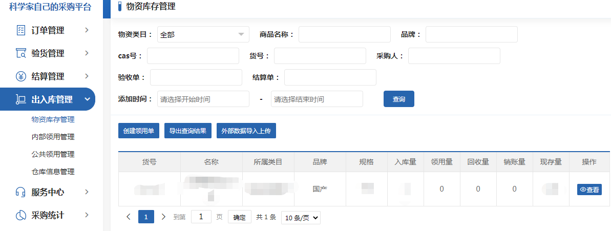 点击“出入库管理”,进入物资库存管理,提供物资库存的存储信息搜索、导出、查看功能。